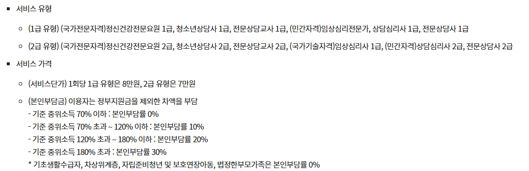 A: 상담 비용은 '국민행복카드'를 통해 결제하며, 소득에 따라 지원 금액이 달라집니다. 국민행복카드가 없으면 신청 시 발급을 함께 신청할 수 있습니다.
