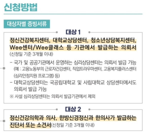 정신의료기관에서 우울증, 불안 등의 심리적 문제를 진단받고 상담 필요성이 인정된 사람도 자격을 갖출 수 있어요. 진단서를 통해서 상담의 필요성을 인정받는 것이 중요하답니다.