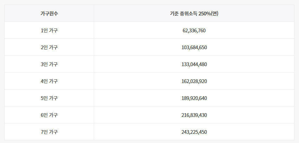 이 연령대 내에 있다면 다음으로 소득 요건을 충족해야 하는데, 중위소득의 일정 비율 이하인 경우에만 가입이 가능해요.