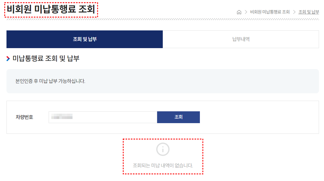 그리고 납부를 하셨다면, 본인인증 후에 미납통행료 납부내역 조회가 가능합니다.