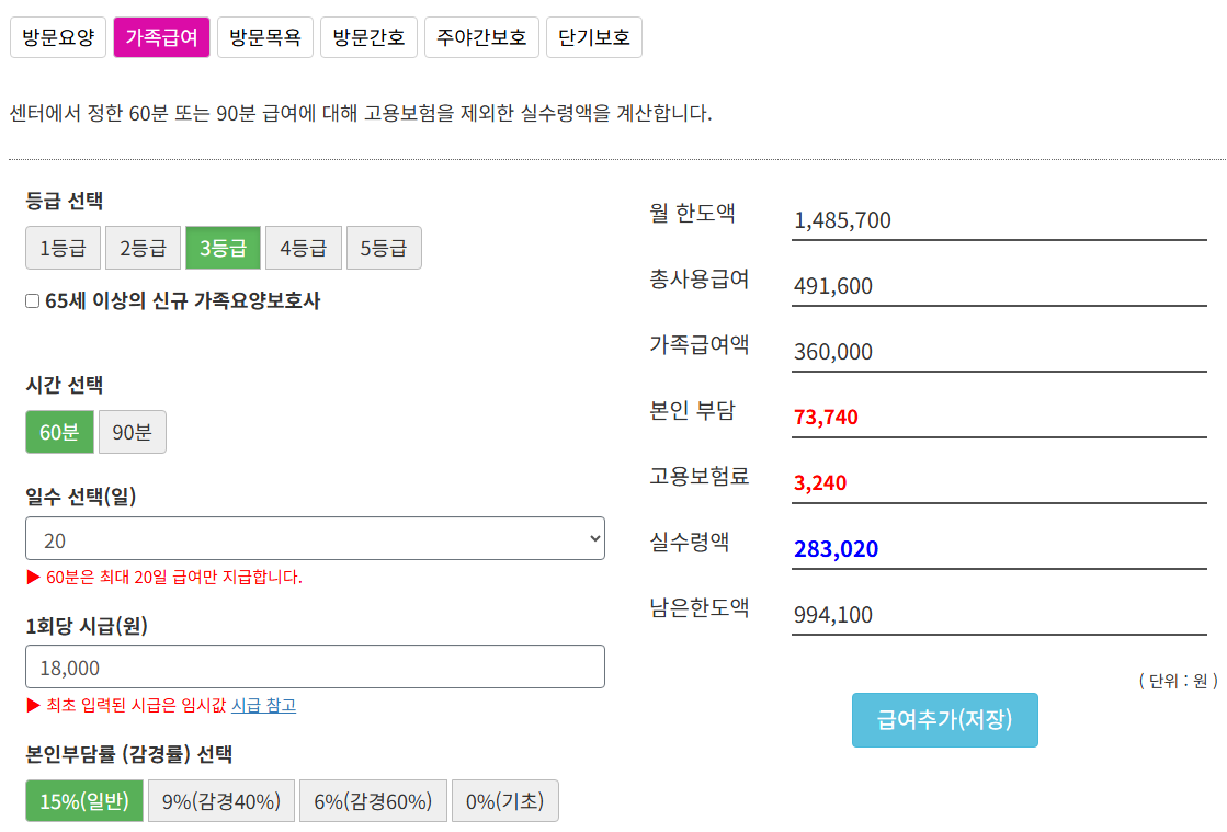 가족요양보호사 급여는 장기요양보장이 지원하는 금액 외에도 일정 비율의 본인부담금이 발생해요.