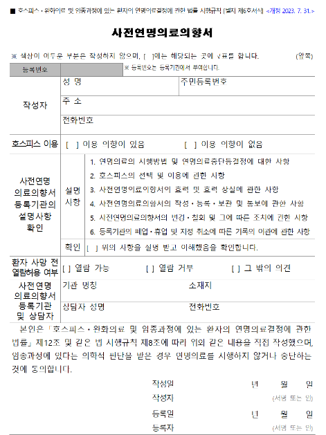 🔽 사전연명의료의향서 서식 🔽