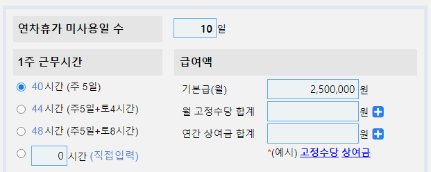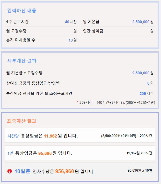 또한 연차 미사용 일수와 근무시간, 급여액을 입력하면, 1일 통상임금이 자동으로 계산되어, 본인의 연차수당 금액을 알 수 있으니, 한 번쯤 확인해 보는 것도 좋을 것 같습니다.