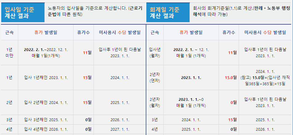본인의 입사일자와 계산일자를 입력하면, 입사일과 회계일 기준으로 연차일수 및 미사용 시 연차수당 발생일을 한 눈에 확인해 볼 수 있습니다.