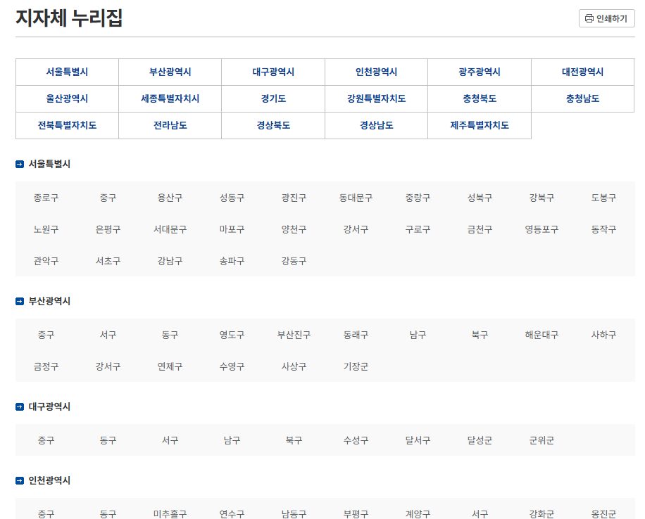 특히 정부와 지자체는 주요 서비스를 누리집 바로가기 형태로 제공합니다.