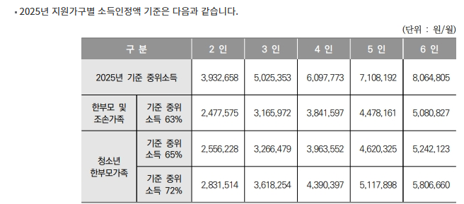 또한 소득인정액이 기준 중위소득 63% 이하인 경우 자격을 갖추게 됩니다.