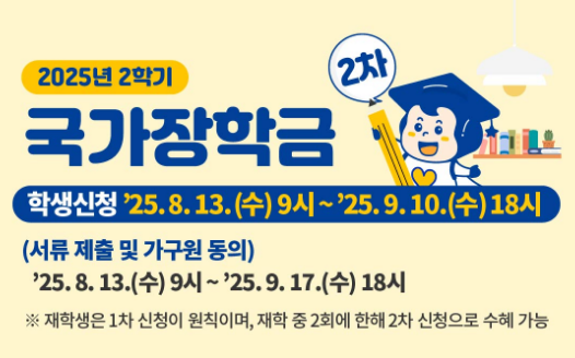 국가장학금은 학기별로 신청 기간이 정해져 있으며 보통 2회차로 나뉩니다.