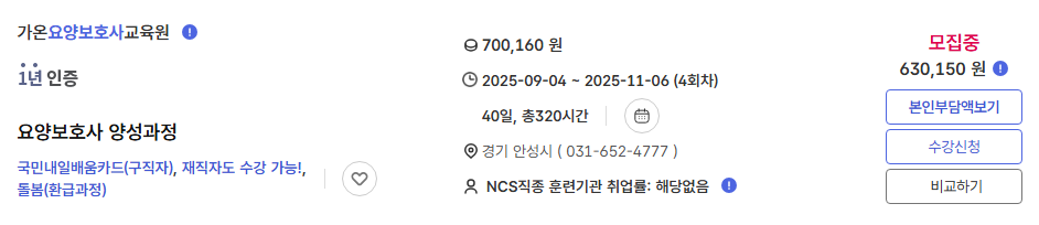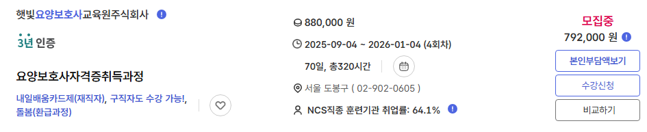 국비 혜택을 활용하면 자부담 비용은 10~20만 원대 수준으로 낮아집니다.