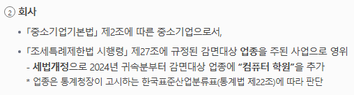 중소기업 여부는 중소기업기본법과 조세특례제한법 시행령에서 정한 기준으로 판단됩니다.