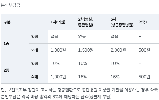 예를 들어 의원급 진료에서 1종은 1,000원 정액이나 2종은 1,500원 부담 구조입니다.