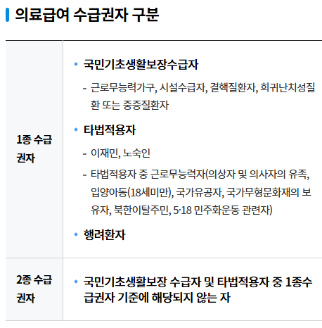 의료급여 1종은 생계·의료급여 수급자, 시설입소자, 희귀난치질환자, 결핵 환자 등이 해당됩니다.