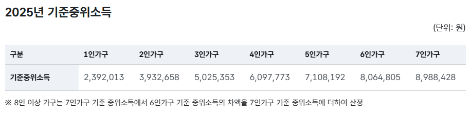 따라서 매년 8월~9월경 발표되는 중위소득 공고를 반드시 확인해야 정확한 지원 자격을 알 수 있습니다.