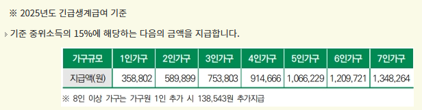 2025년 기준으로 1인 가구는 약 82만 원, 4인 가구는 약 207만 원 이하일 때 지원 대상이 됩니다.