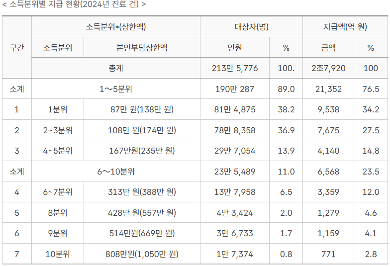소득분위별 상한액은 매년 조정되며, 2024년 기준으로는 약 87만 원에서 665만 원 구간으로 설정되었습니다.