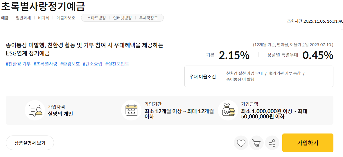 초록별사랑정기예금 종이통장 미발행, 친환경 활동 및 기부 참여 시 우대혜택을 제공하는 ESG연계 정기예금