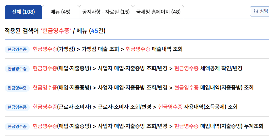 이용 메뉴별 상세 기능은 국세청 현금영수증 홈페이지 도움말에서 확인하실 수 있습니다.