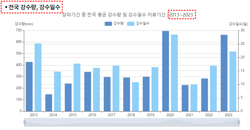 2024년 장마 예상기간을 알아보려면 이전 해의 장마 기간과 강수량 등을 파악해야 하며, 이는 기상자료 개방포털 데이터로 확인해 볼 수 있습니다.