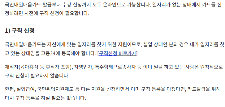카드는 고용24 또는 고용센터를 통해 신청할 수 있으며 절차는 비교적 간단하게 구성됩니다.