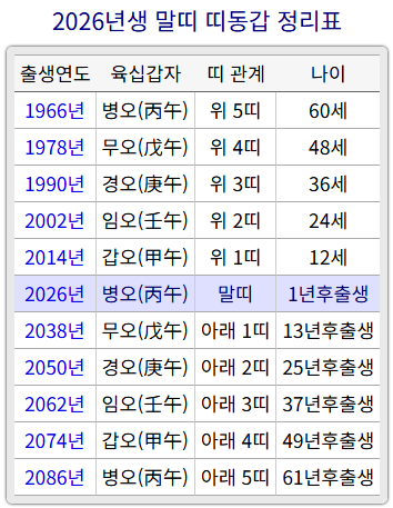 2026년은 말띠가 기준이므로 다른 띠들은 이 지점을 중심으로 상대적인 연령 흐름이 결정됩니다.