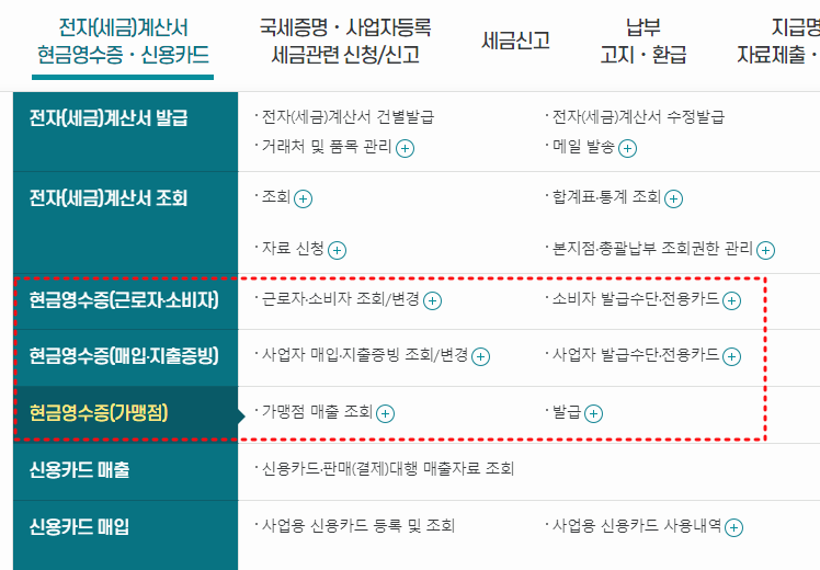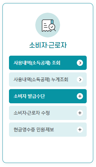 홈택스를 접속해서 현금영수증이 포함된 메뉴를 선택하면, 가맹점 기준 뿐만 아니라 근로자·소비자 기준으로도 현금영수증 발급 내역을 확인할 수 있습니다.