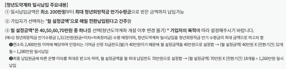 청년희망적금의 만기금액 연계에 대해 궁금증을 가진 분들이 많습니다. 일시납입 시, 만기 수령금 전액을 납입할 필요는 없습니다.