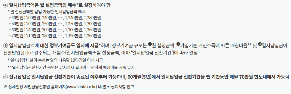 그러나 실제로는 40만원, 50만원, 60만원, 70만원 등의 배수로 월 납입금액을 자유롭게 설정할 수 있으며, 이는 개인의 재정 상황에 맞춰 탄력적으로 계획을 세울 수 있도록 도와줍니다.