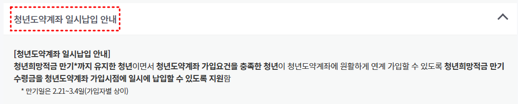 2022년 2월에 출시되었던 청년희망적금이 올해 만기금액을 받게 되는데, 이를 청년도약계좌로 일시납입 형태로 연계하여 이용하실 수 있습니다.