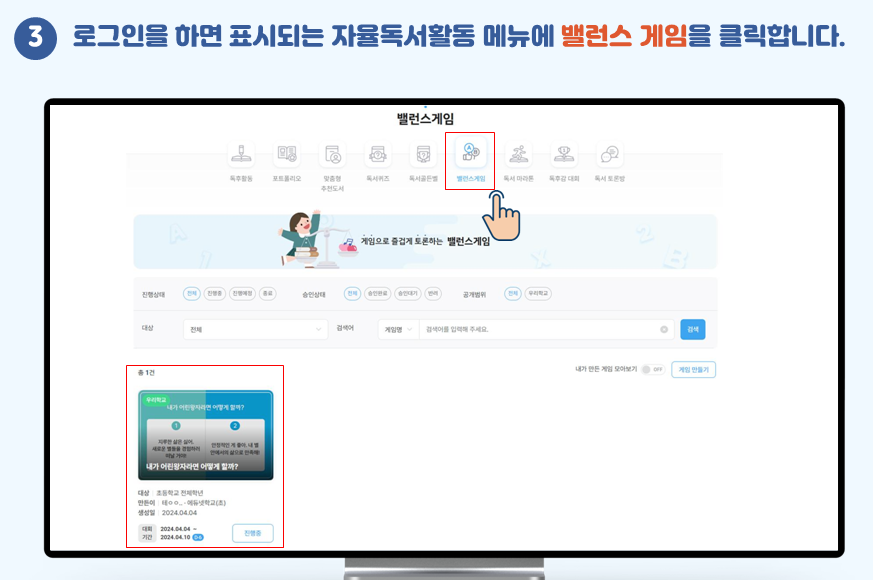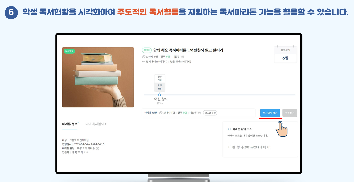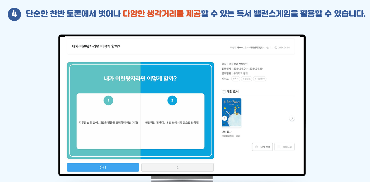 밸런스 게임, 독서 마라톤 등 다양한 형태의 독서교육 활동 그룹을 개설하여 학생들의 적극적인 참여를 유도할 수 있습니다.