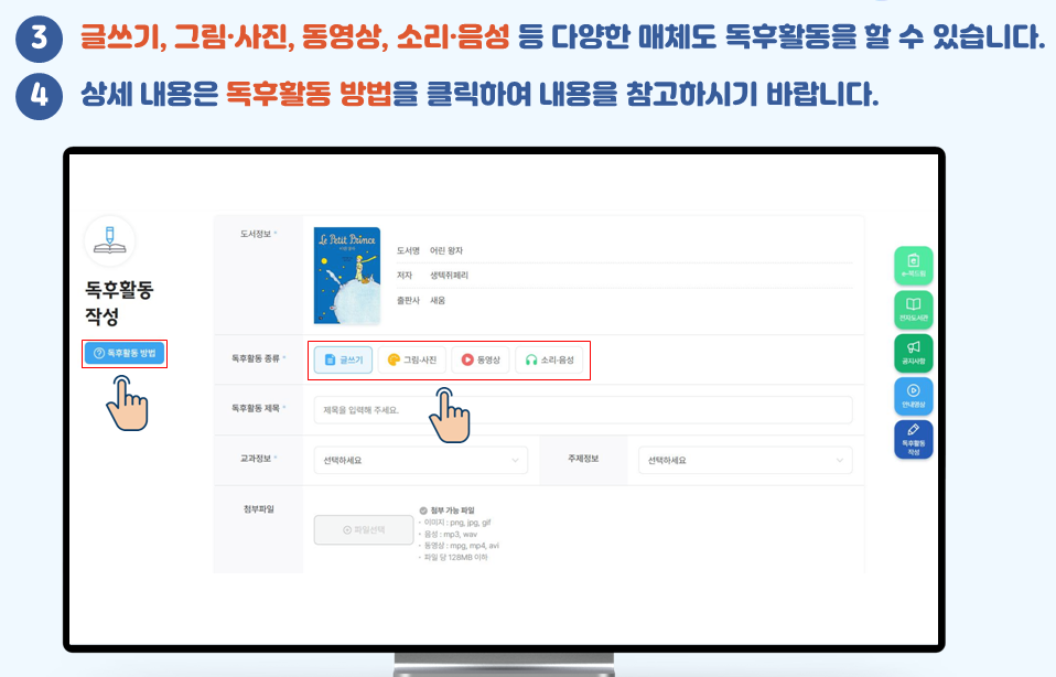 학생들은 자신의 독서 후 활동을 사진, 음성, 텍스트, 영상 파일 등 다양한 형태로 업로드하여 기록할 수 있습니다.