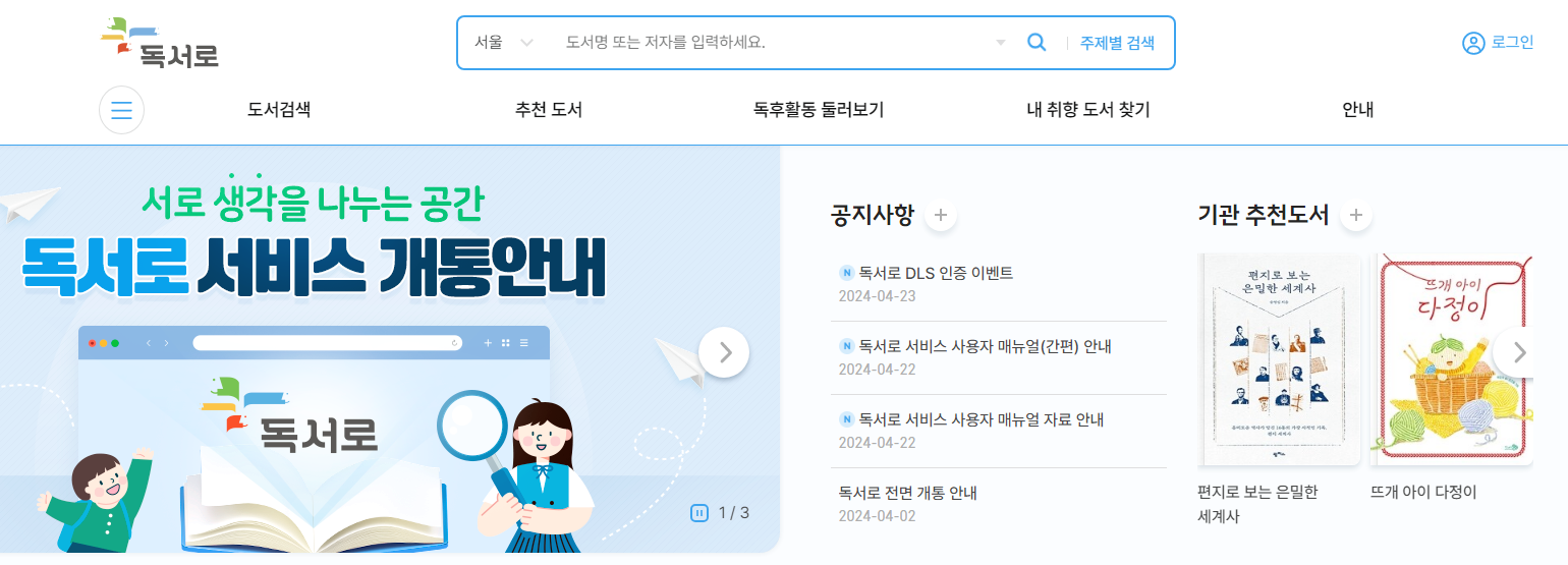 독서로 회원가입을 위해서 홈페이지를 접속해서, 우측 상단에 있는 로그인을 클릭하여 회원가입을 진행할 수 있습니다.