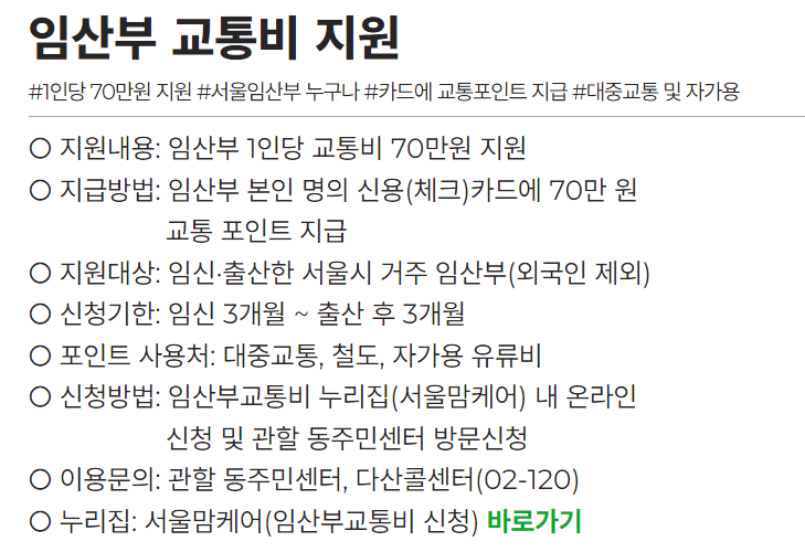 임신과 출산을 겪는 서울시민을 위해 최대 70만 원의 교통비를 지원합니다.