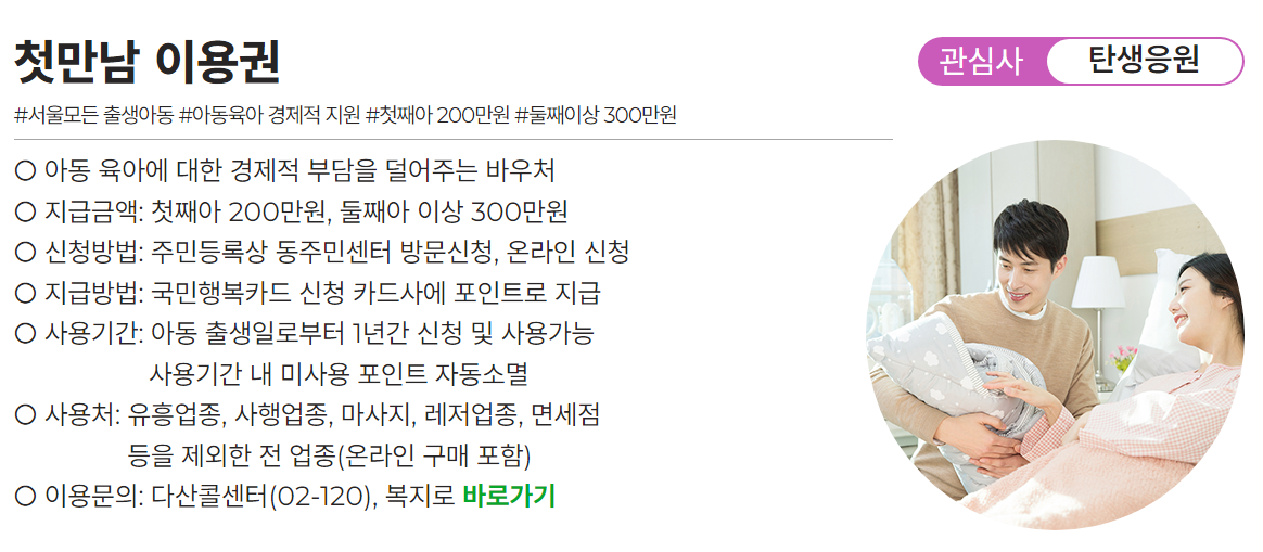 서울시에서는 모든 출생 아동에게 경제적 지원을 제공하는 '첫만남 이용권' 정책을 시행하고 있습니다. 첫째 아동에게는 200만 원, 둘째 아동 이상에게는 300만 원의 지원금이 제공됩니다.