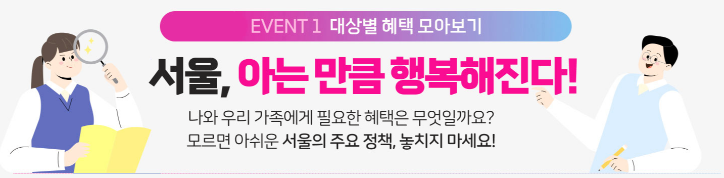 상당히 많은 서울시 정책들을 모두 확인하기 어렵기 때문에, 슬기로운 서울생활 사이트를 통해서 맞춤 혜택도 받고 이벤트도 참여하는 시간이 되었으면 좋겠습니다.