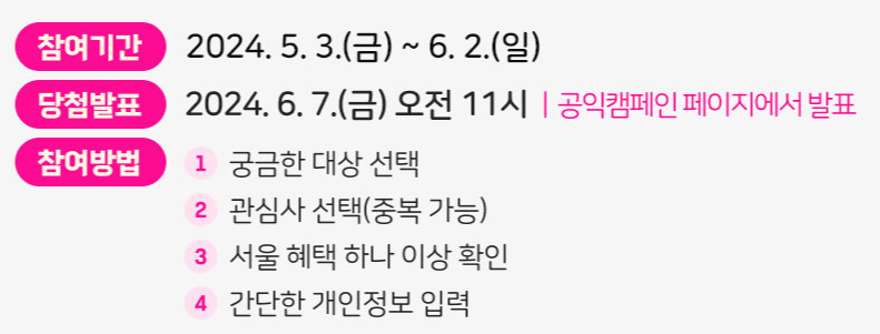 2024년 5월 3일(금) ~ 6월 2일(일) 동안에 슬기로운 서울생활을 통해 나에게 맞는 서울시 정책을 찾아봄으로써 이벤트에 참여할 수 있습니다.