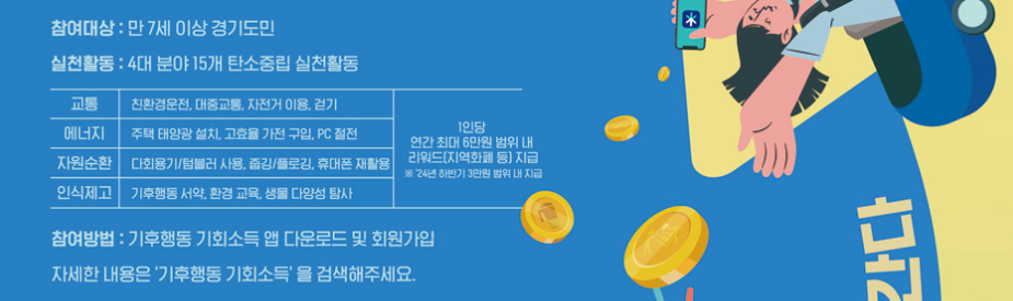기후변화로 인한 다양한 문제를 해결하기 위한 행동인 기후행동을 하게 되면 기회소득으로 경기도 도민일 경우 연간 최대 6만원의 리워드를 지급받을 수 있습니다.
