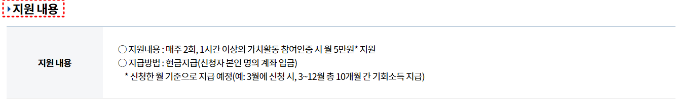 또한 1960년 1월 1일부터 2011년 12월 31일 까지의 출생자여야 하며, 장애인 기회소득 지원금은 매주 2회 1시간 이상의 가치활동 참여인증 시에 월 10만원 지원받을 수 있습니다.