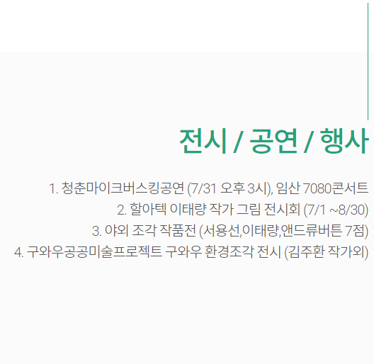 7월 31일 오후 3시에 열리는 청춘 마이크 버스킹 공연을 즐길 수 있고, 8월 30일까지 진행되는 할아텍 이태량 작가 그림 전시회에도 참여할 수 있습니다.