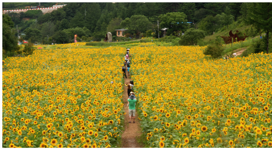 해바라기 100만송이와 함께하며 연못과 돌담길 정원을 거닐 수 있는 꽃밭관람 프로그램을 2024년 태백 해바라기 축제에서 참여해볼 수 있습니다.