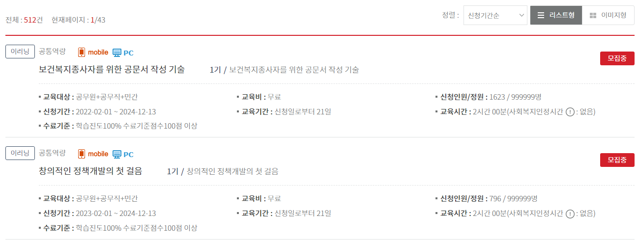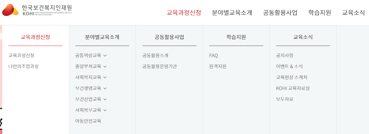 분야별로 찾아보기 어렵다면 한국보건복지 인재원 교육과정신청 메뉴를 통해서 약 500여개의 온라인 강의 목록의 내용을 확인해 볼 수 있습니다.