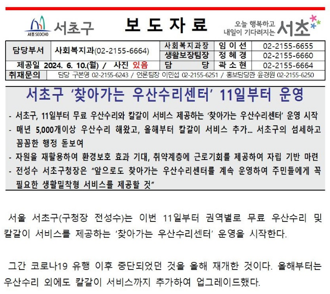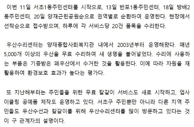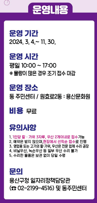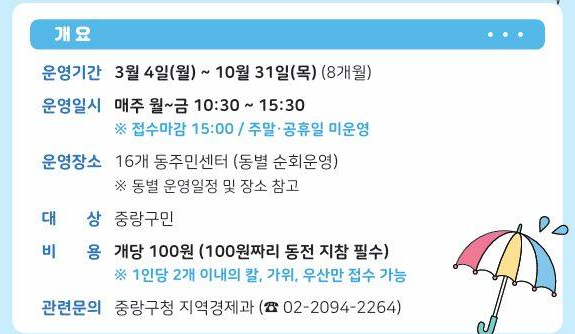 보통 각 자치구에서는 우산수리와 같은 생활편의 서비스를 제공하고 있지만, 모든 구에서 동일한 서비스를 제공하는 것은 아니기 때문에 미리 확인해 보는 것이 필요해요.