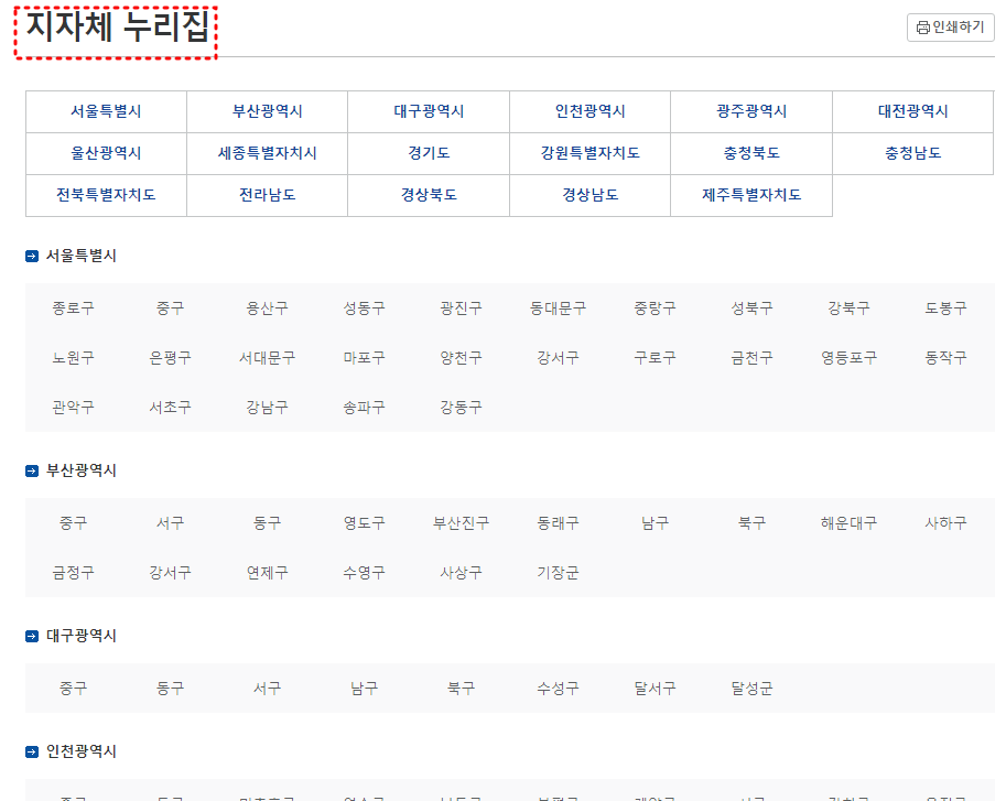 행정안전부에서 제공하는 지자체 누리집을 통해서 원하는 지자체를 선택하여 홈페이지를 바로 접속하여 간단하게 확인해볼 수 있으니 직접 해보는 것이 좋습니다.