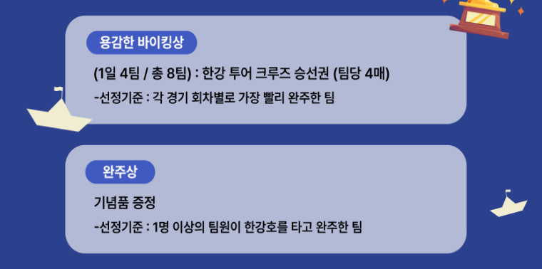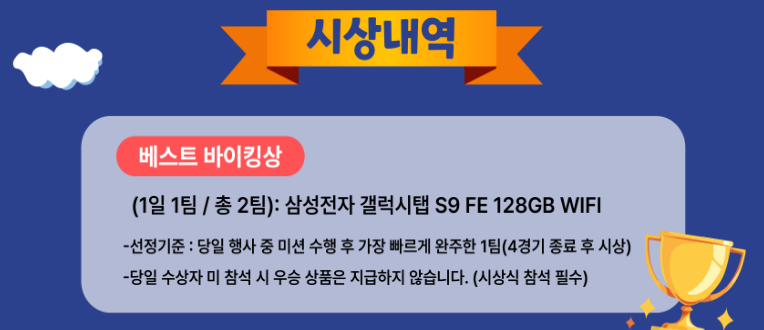 가장 빨리 미션을 완수한 팀에게는 삼성전자 갤럭시탭 S9 FE 128GB WIFI가 주어지며, 용감한 바이킹상으로 한강 투어 크루즈 승선권이 준비돼 있어요.