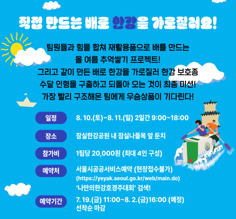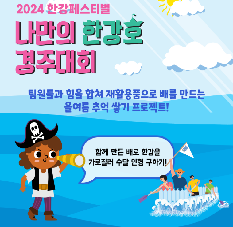 2024 한강 페스티벌의 하이라이트인 나만의 한강호 경주대회가 돌아왔어요. 이번 대회는 잠실한강공원에서 열리며, 재활용품을 활용해 팀원들과 함께 배를 만들고, 한강을 가로질러 수달 인형을 구출하는 특별한 경험을 할 수 있어요.