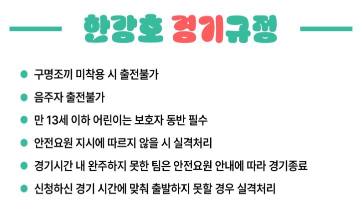 또한, 구명조끼를 착용하지 않거나 음주 상태로는 경기에 출전할 수 없어요. 만 13세 이하 어린이는 반드시 보호자와 함께해야 하며, 안전요원의 지시에 따르지 않으면 실격 처리될 수 있으니 주의해야 해요.