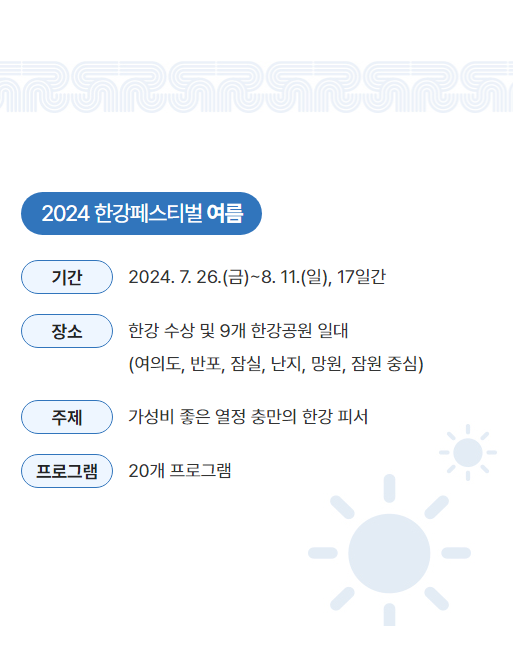 2024년 7월 26일(금)부터 8월 11일(일)까지 17일 간 2024 한강 페스티벌 여름이 진행되어 한강 수상 및 9개 한강공원 일대에서 참여할 수 있습니다.