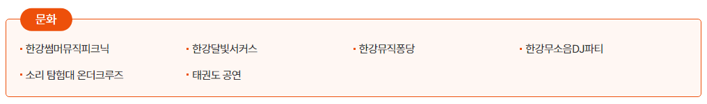 한강썸머뮤직피크닉, 한강달빛서커스, 한강뮤직퐁당, 한강모소음DJ파티 등 흥미롭고 재밌는 문화 프로그램도 즐길 수 있으며 관련정보는 공식 홈페이지에서 확인 가능합니다.