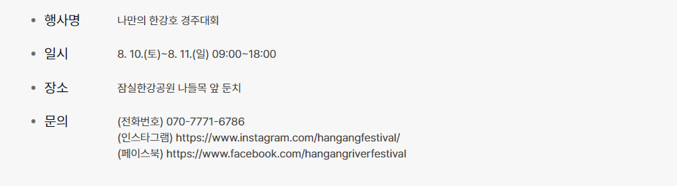 이번 나만의 한강호 경주대회는 8월 10일(토)와 8월 11일(일) 양일간 오전 9시부터 오후 6시까지 진행돼요.