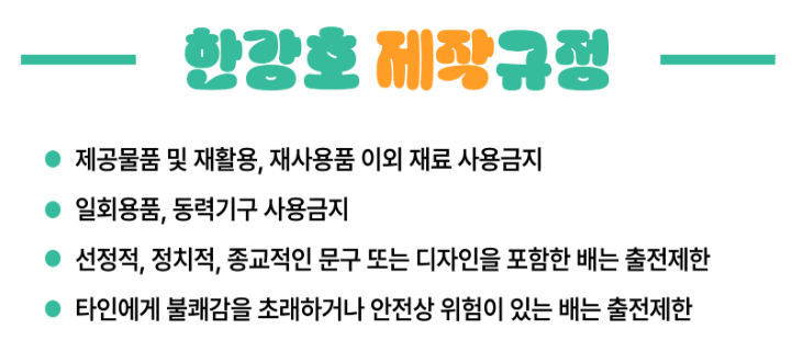 배를 만들 때는 주최 측에서 제공하는 재료 외에 추가적인 재활용품을 사용할 수 있어요. 일회용품이나 동력기구는 사용할 수 없으며, 선정적이거나 정치적, 종교적인 문구를 포함한 디자인은 금지돼요.