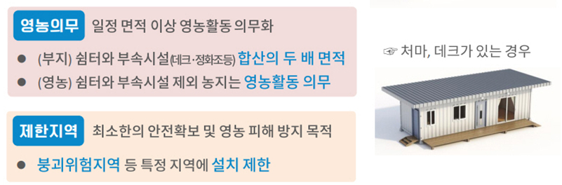 농촌 체류형 쉼터는 농지법 시행령과 시행규칙 개정을 통해 공식적으로 인정받으며, 가설 건축물 형태로 설치될 수 있습니다.