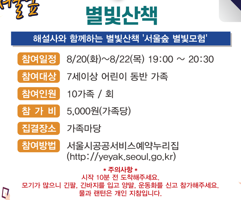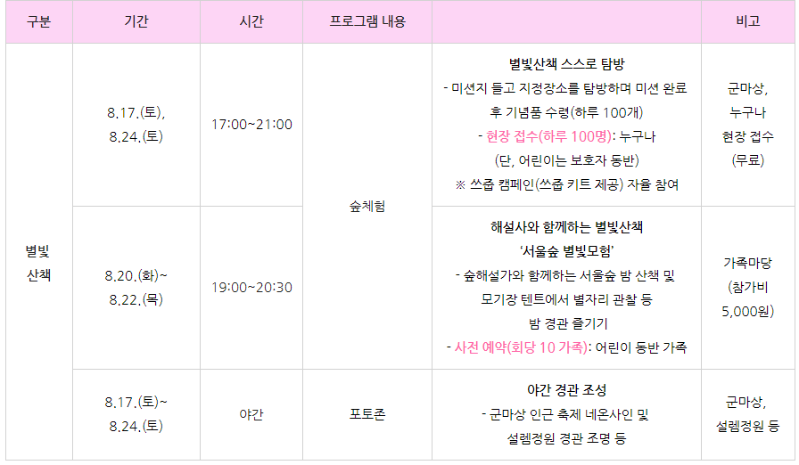 또한, 날씨가 더운 여름이므로 충분한 물과 간단한 간식을 챙겨오는 것이 좋으며, 특히 별빛산책 프로그램은 저녁에 진행되므로 편안한 옷차림과 신발을 준비하는 것이 좋아요.